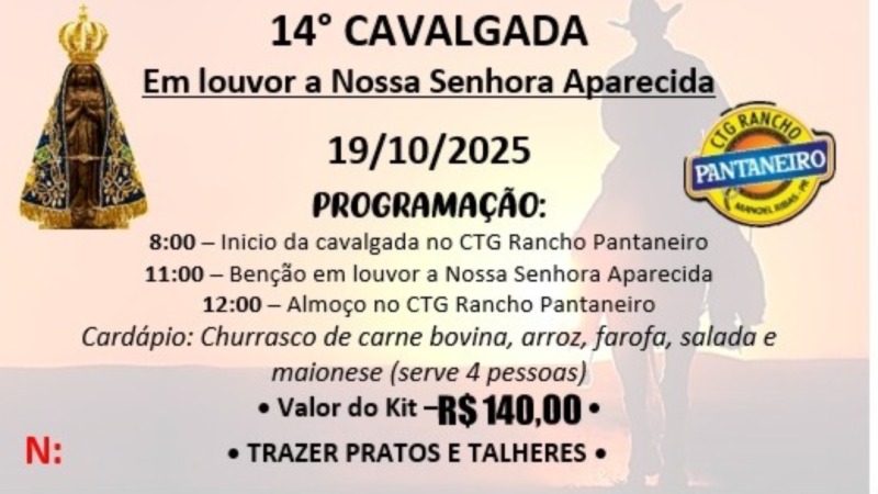 Em Manoel Ribas, Convites para o almoço da 14ª Cavalgada à Nossa Senhora Aparecida já estão à venda.